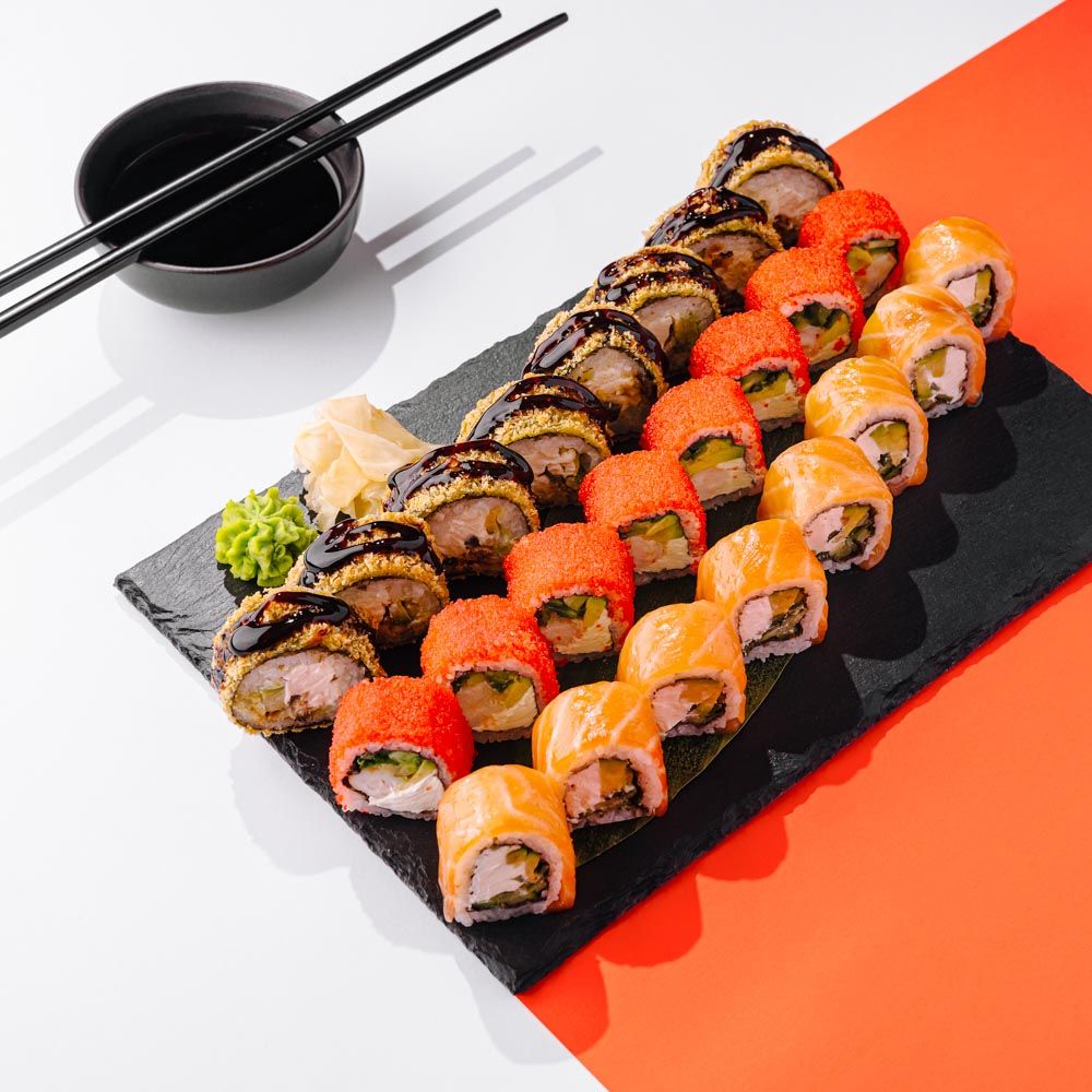 Сет из 3 роллов: Philadelphia Shi, California Ebi и Tempura Unagi.