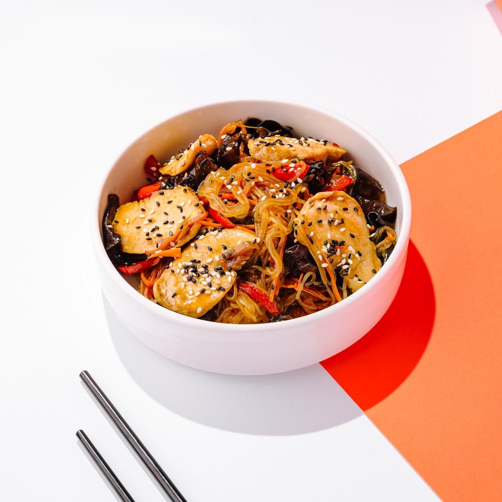 Фунчоза с курицей, морковью, перцем капия и древесными грибами в соусе вок, с кунжутом.