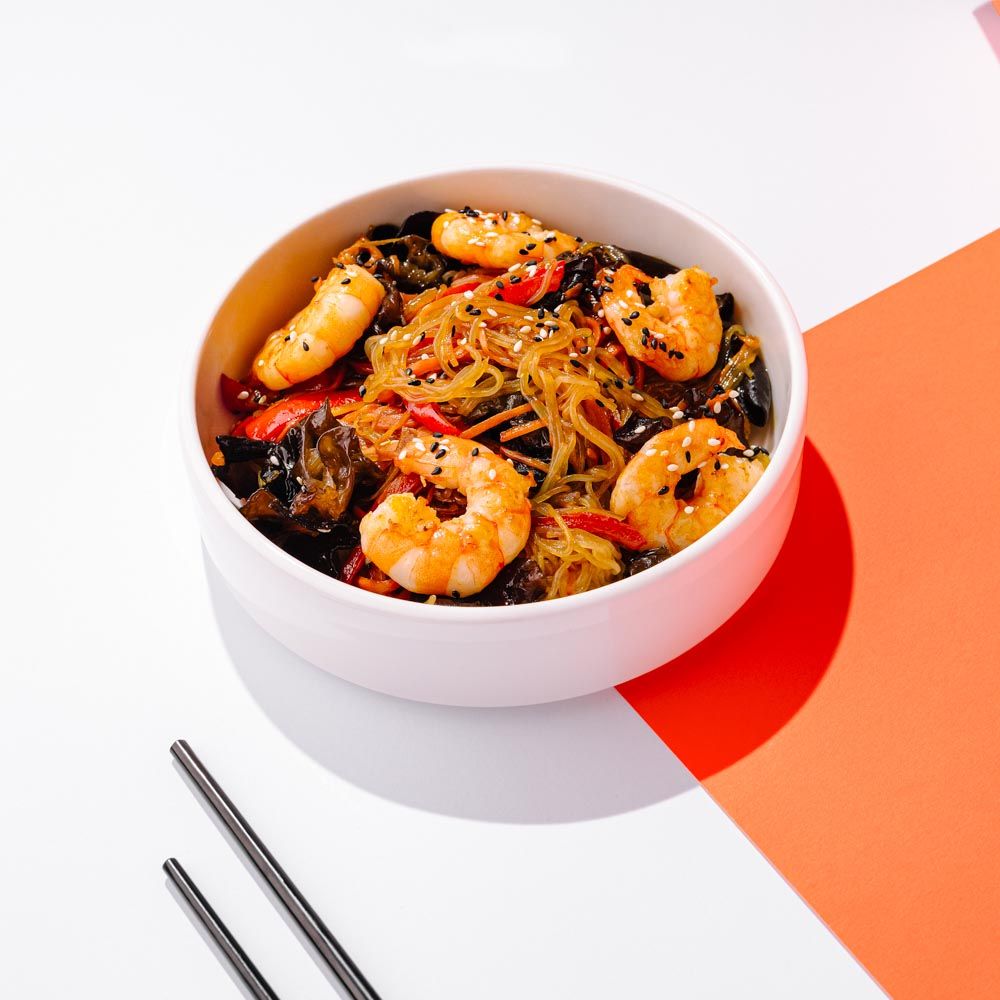 Фунчоза с креветками, морковью, перцем капия и древесными грибами в соусе вок, с кунжутом.