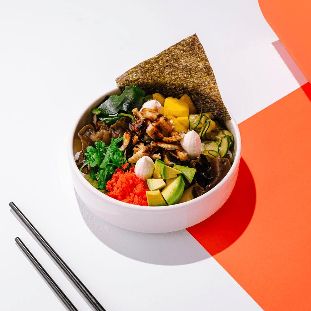 Боул с рисом, угрем, авокадо, манго и японскими водорослями, маринованными древесными грибами, с икрой масаго, огурцом маринованным, сливочным сыром, с ароматными соусами.