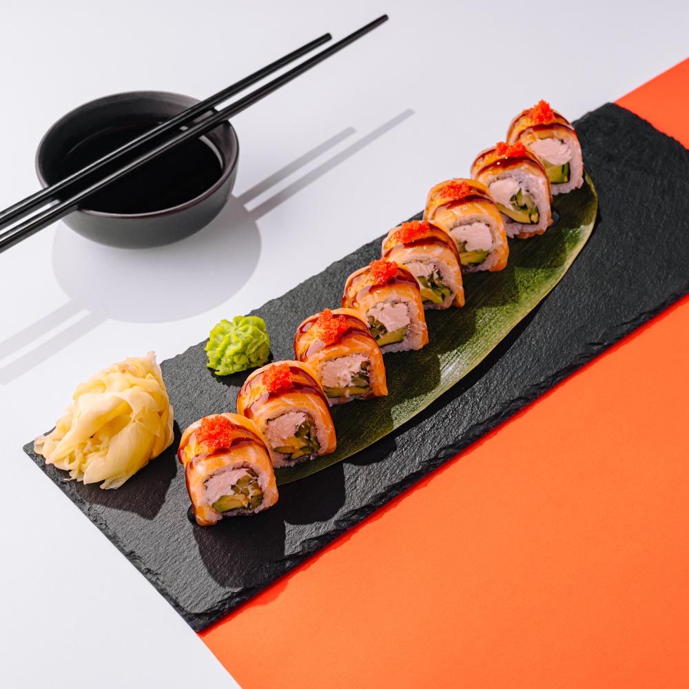 Ролл с лососем, авокадо, огурцом и сливочным сыром, с соусом унаги, манго чатни и икрой масаго.