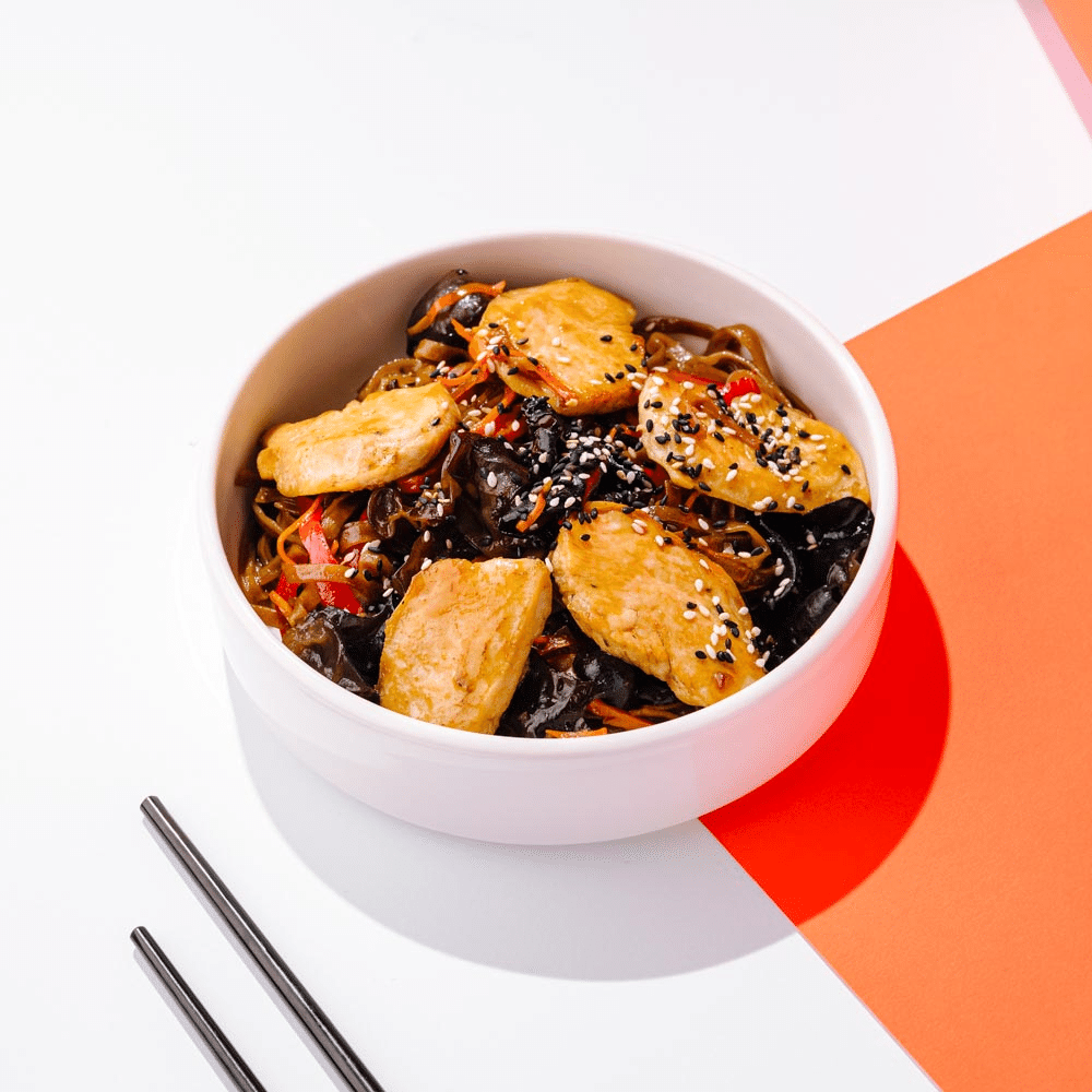 Соба с курицей, морковью, перцем капия и древесными грибами в соусе вок, с кунжутом.